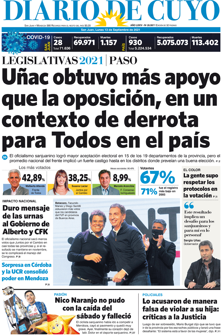 Diario de Cuyo | HOME | Noticias Tapa Edición 13 de Septiembre del 2021 Por Redacción Diario de Cuyo 13/09/2021 · 0:00 Escuchar la noticia Escuchar la noticia Your browser doesn’t support HTML5 audio Ver los comentarios ›