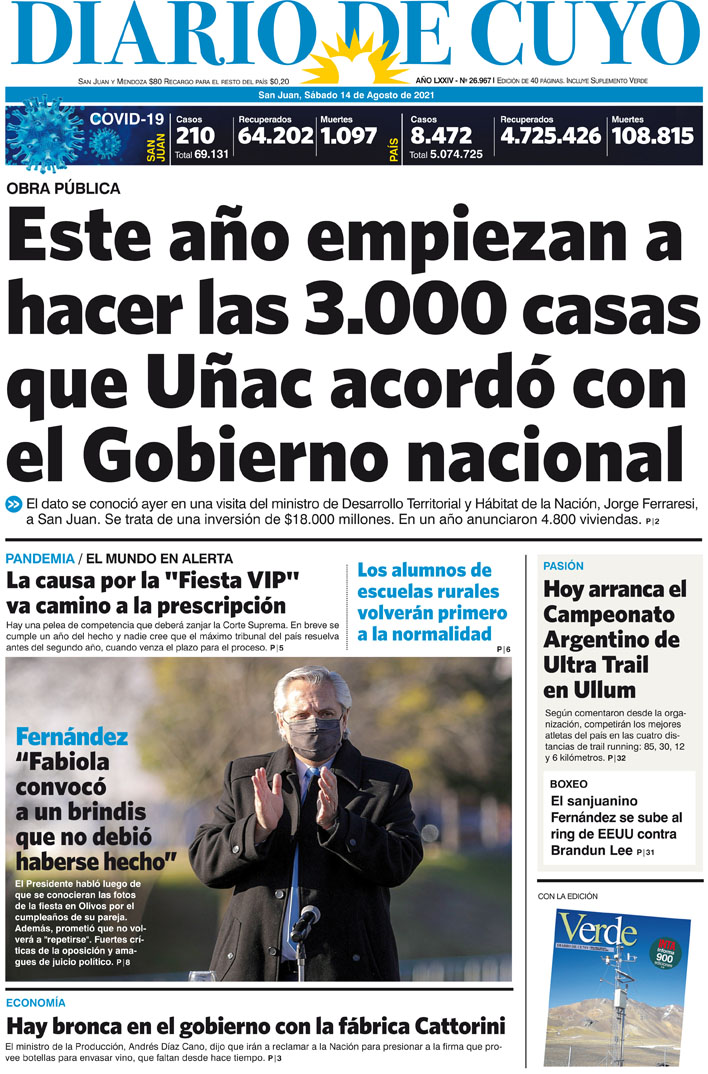 Diario de Cuyo | HOME | Noticias Tapa Edición 14 de Agosto del 2021 Por Redacción Diario de Cuyo 13/08/2021 · 0:00 Escuchar la noticia Escuchar la noticia Your browser doesn’t support HTML5 audio Ver los comentarios ›