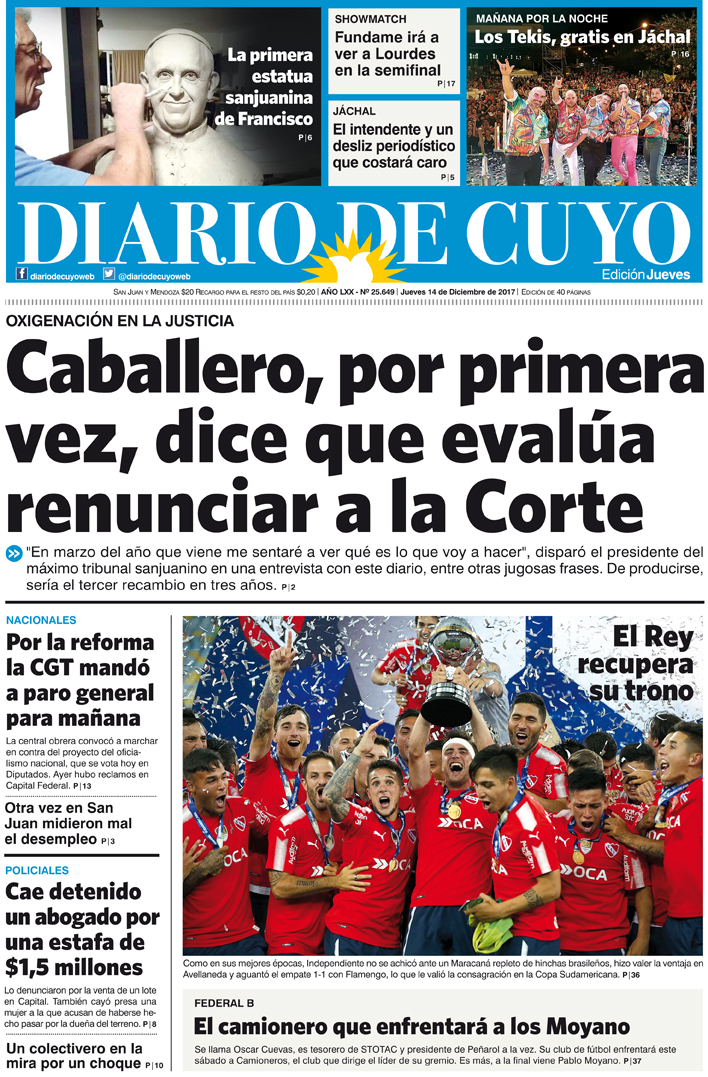 Diario de Cuyo | HOME | Noticias | Tapa Edición Tapa Edición 14 de Diciembre de 2017 Por Redacción Diario de Cuyo 13/12/2017 · 0:00 Escuchar la noticia Escuchar la noticia Your browser doesn’t support HTML5 audio Tapa Edición Ver los comentarios ›