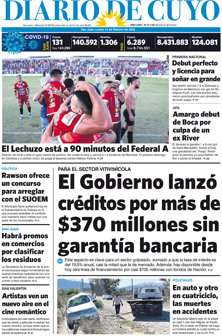 Diario de Cuyo | HOME | Noticias Tapa Edición 14 de Febrero del 2022 Por Redacción Diario de Cuyo 14/02/2022 · 0:00 Escuchar la noticia Escuchar la noticia Your browser doesn’t support HTML5 audio Ver los comentarios ›