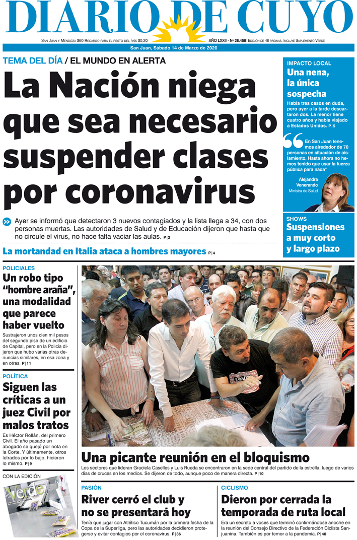 Diario de Cuyo | HOME | Noticias | Tapa Edición Tapa Edición 14 de Marzo de 2020 Por Redacción Diario de Cuyo 13/03/2020 · 0:00 Escuchar la noticia Escuchar la noticia Your browser doesn’t support HTML5 audio Tapa Edición Ver los comentarios ›
