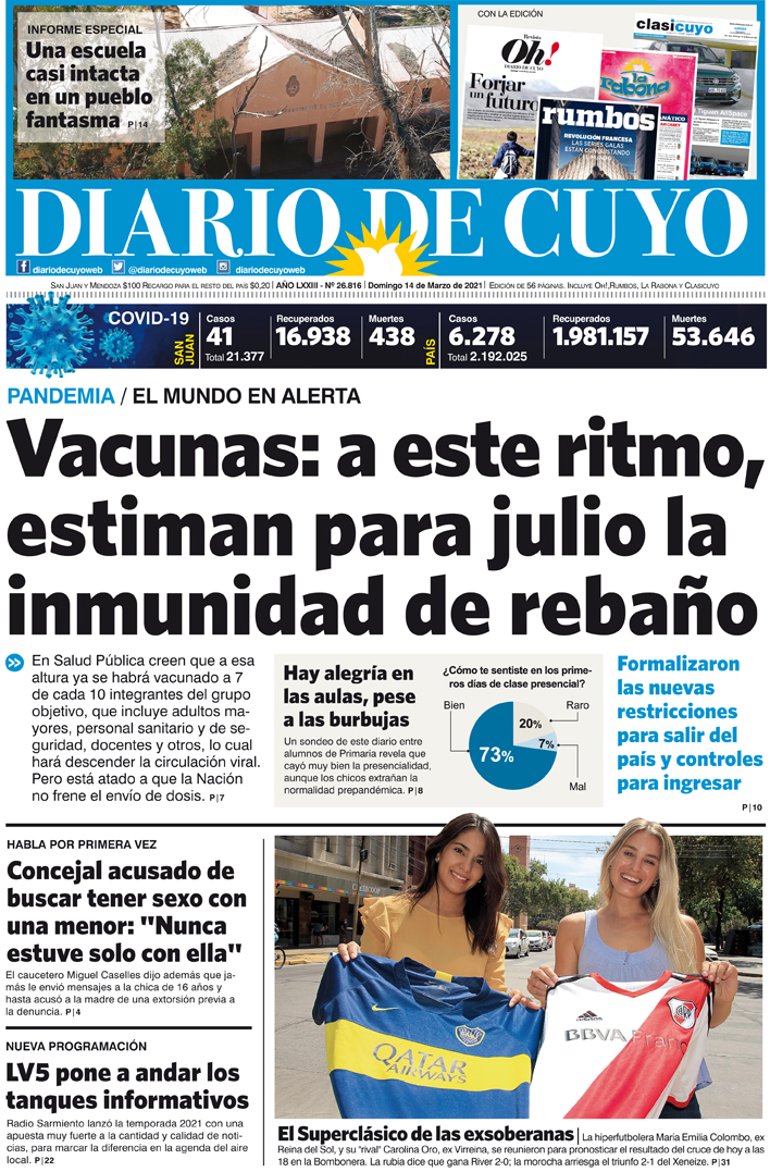 Diario de Cuyo | HOME | Noticias Tapa Edición 14 de Marzo del 2021 Por Redacción Diario de Cuyo 13/03/2021 · 0:00 Escuchar la noticia Escuchar la noticia Your browser doesn’t support HTML5 audio Ver los comentarios ›