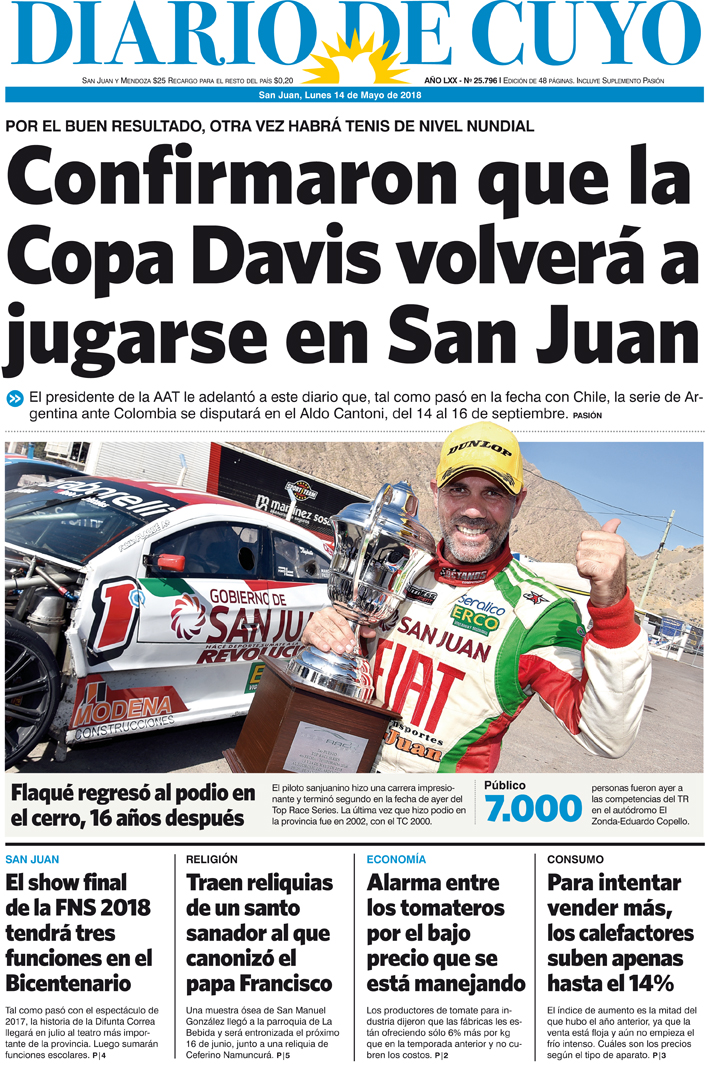 Diario de Cuyo | HOME | Noticias Tapa Edición 14 de Mayo de 2018 Por Redacción Diario de Cuyo 14/05/2018 · 0:00 Escuchar la noticia Escuchar la noticia Your browser doesn’t support HTML5 audio Ver los comentarios ›