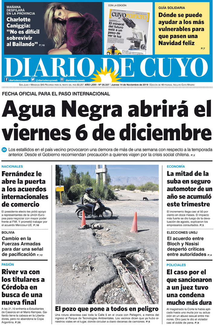 Diario de Cuyo | HOME | Noticias | Tapa Edición Tapa Edición 14 de Noviembre 2019 Por Redacción Diario de Cuyo 13/11/2019 · 0:00 Escuchar la noticia Escuchar la noticia Your browser doesn’t support HTML5 audio Tapa Edición Ver los comentarios ›