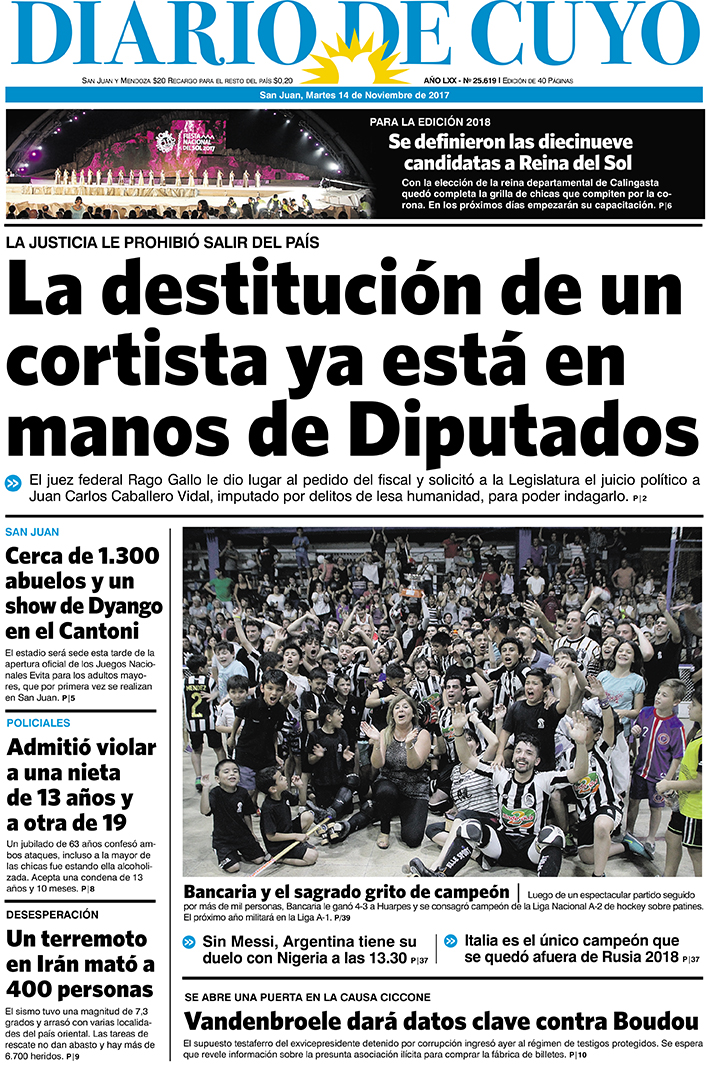Diario de Cuyo | HOME | Noticias | Tapa Edición Tapa Edición 14 de Noviembre del 2017 Por Redacción Diario de Cuyo 14/11/2017 · 0:00 Escuchar la noticia Escuchar la noticia Your browser doesn’t support HTML5 audio Tapa Edición Ver los comentarios ›