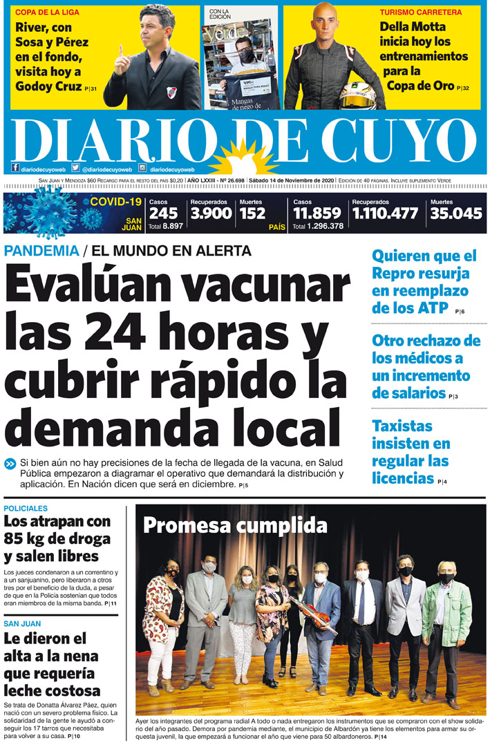 Diario de Cuyo | HOME | Noticias Tapa Edición 14 de Noviembre del 2020 Por Redacción Diario de Cuyo 13/11/2020 · 0:00 Escuchar la noticia Escuchar la noticia Your browser doesn’t support HTML5 audio Ver los comentarios ›