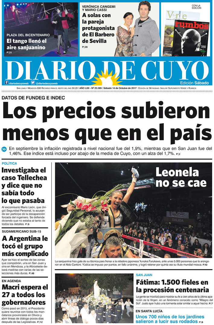 Diario de Cuyo | HOME | Noticias Tapa Edición 14 de Octubre de 2017 Por Redacción Diario de Cuyo 14/10/2017 · 0:00 Escuchar la noticia Escuchar la noticia Your browser doesn’t support HTML5 audio Ver los comentarios ›
