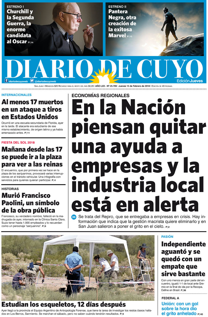Diario de Cuyo | HOME | Noticias | Tapa Edición Tapa Edición 15 de Febrero del 2018 Por Redacción Diario de Cuyo 15/02/2018 · 0:00 Escuchar la noticia Escuchar la noticia Your browser doesn’t support HTML5 audio Tapa Edición Ver los comentarios ›