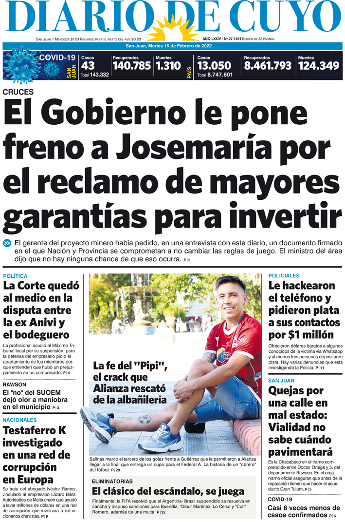 Diario de Cuyo | HOME | Noticias Tapa Edición 15 de Febrero del 2022 Por Redacción Diario de Cuyo 15/02/2022 · 0:00 Escuchar la noticia Escuchar la noticia Your browser doesn’t support HTML5 audio Ver los comentarios ›
