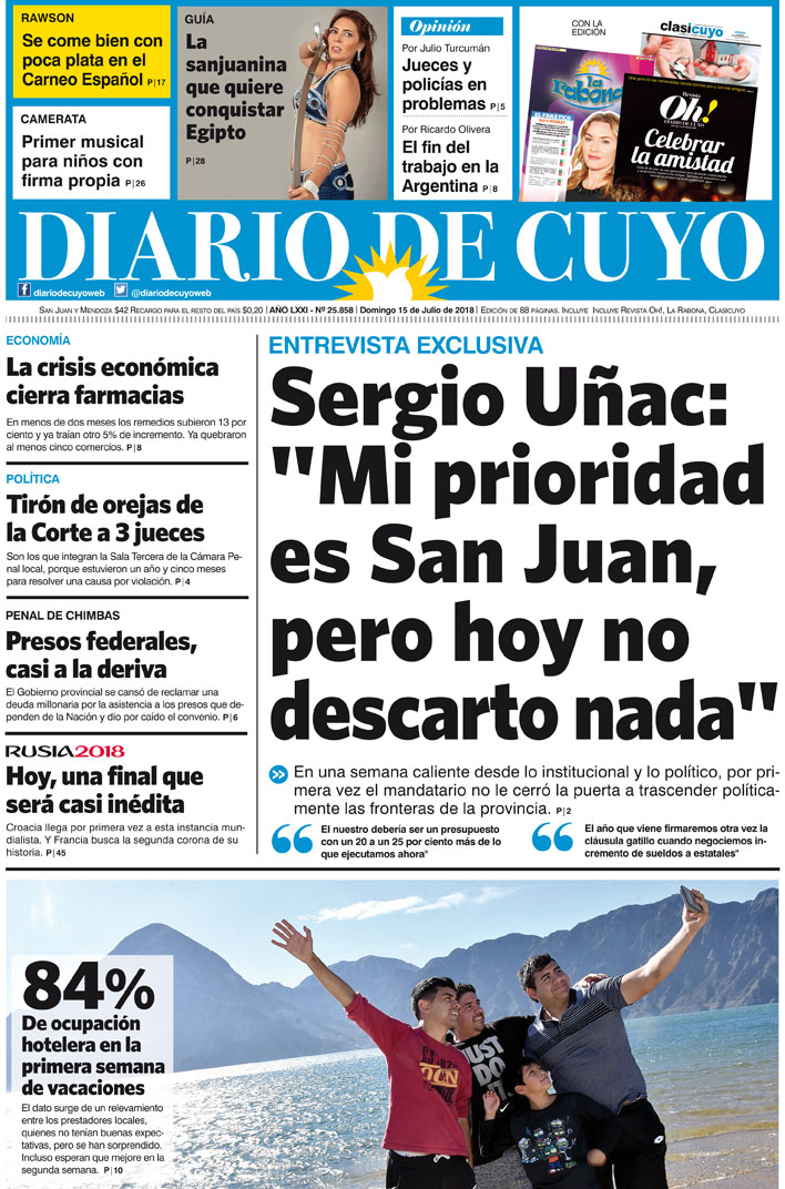 Diario de Cuyo | HOME | Noticias | Tapa Edición Tapa Edición 15 de Julio de 2018 Por Redacción Diario de Cuyo 15/07/2018 · 0:00 Escuchar la noticia Escuchar la noticia Your browser doesn’t support HTML5 audio Tapa Edición Ver los comentarios ›
