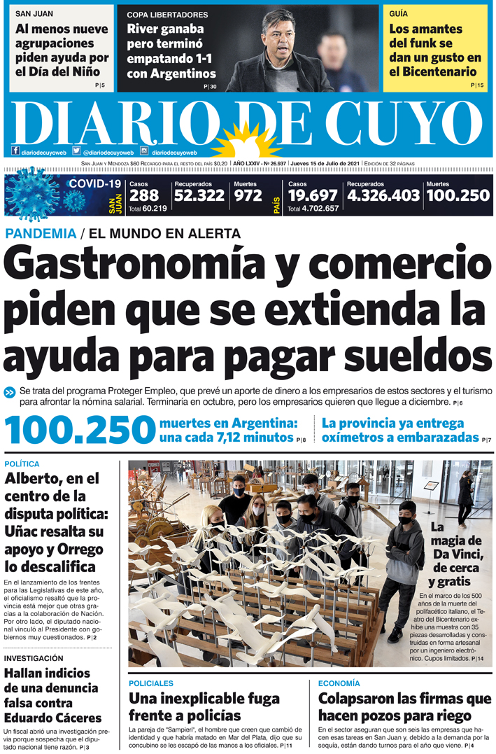 Diario de Cuyo | HOME | Noticias Tapa Edición 15 de Julio de 2021 Por Redacción Diario de Cuyo 15/07/2021 · 0:00 Escuchar la noticia Escuchar la noticia Your browser doesn’t support HTML5 audio Ver los comentarios ›