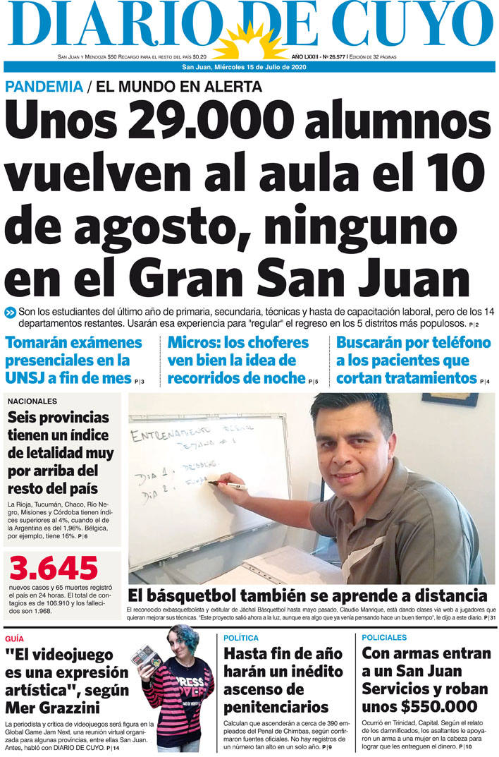 Diario de Cuyo | HOME | Noticias Tapa Edición 15 de Julio del 2020 Por Redacción Diario de Cuyo 14/07/2020 · 0:00 Escuchar la noticia Escuchar la noticia Your browser doesn’t support HTML5 audio Ver los comentarios ›