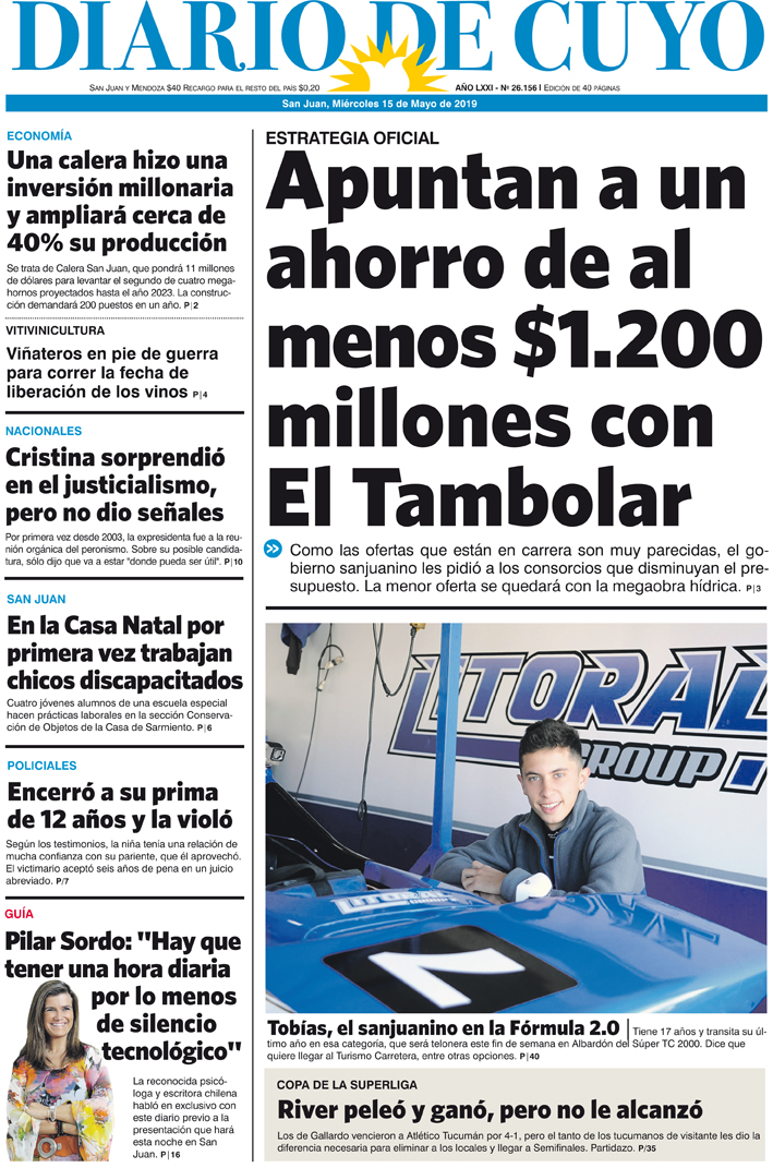 Diario de Cuyo | HOME | Noticias | Tapa Edición Tapa Edición 15 de Mayo 2019 Por Redacción Diario de Cuyo 14/05/2019 · 0:00 Escuchar la noticia Escuchar la noticia Your browser doesn’t support HTML5 audio Tapa Edición Ver los comentarios ›