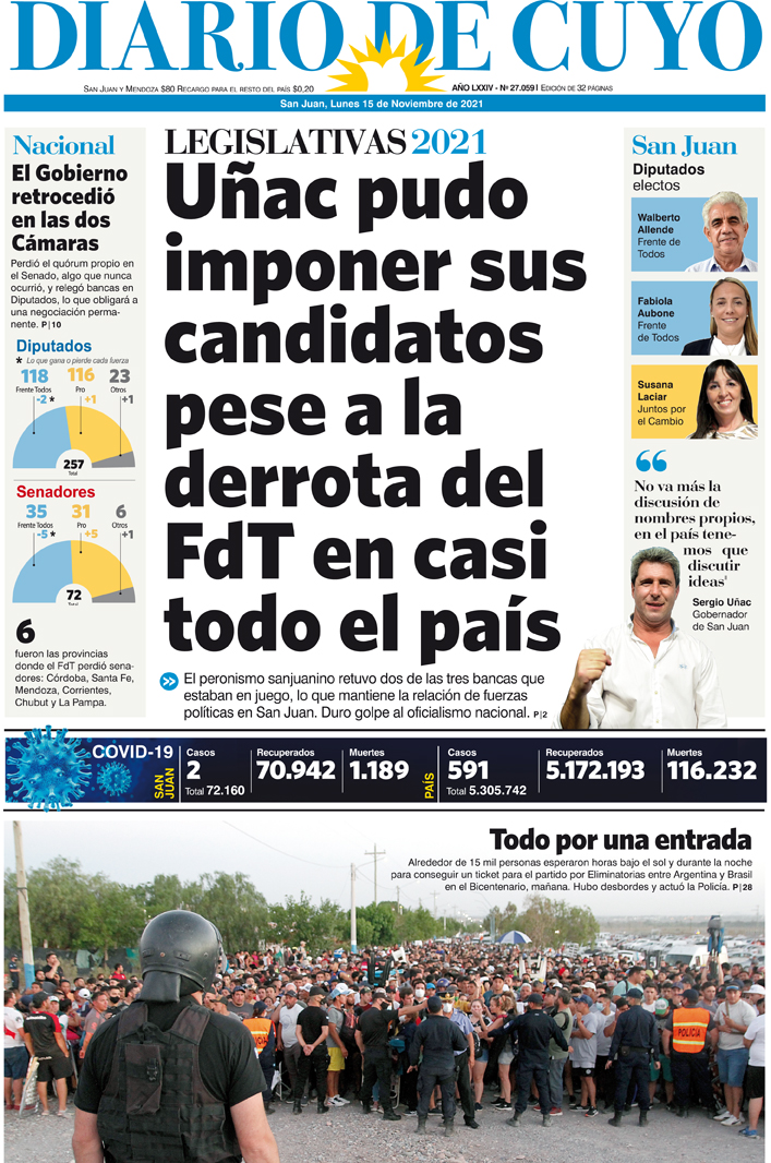 Diario de Cuyo | HOME | Noticias Tapa Edición 15 de Noviembre del 2021 Por Redacción Diario de Cuyo 15/11/2021 · 0:00 Escuchar la noticia Escuchar la noticia Your browser doesn’t support HTML5 audio Ver los comentarios ›