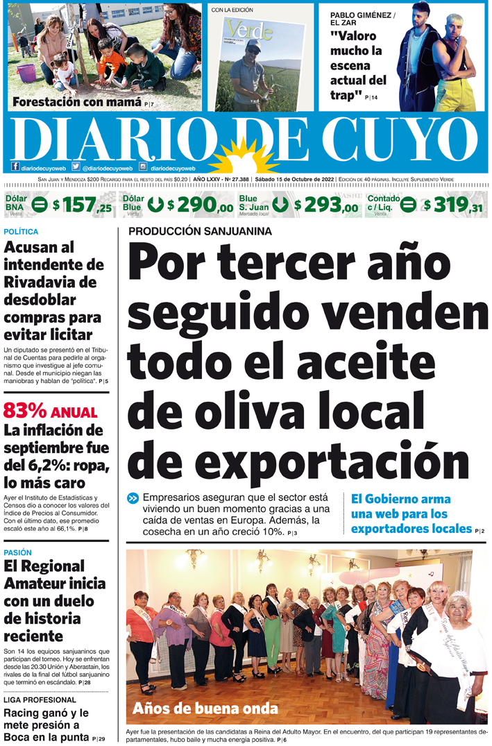 Diario de Cuyo | HOME | Noticias Tapa Edición 15 de Octubre de 2022 Por Redacción Diario de Cuyo 14/10/2022 · 0:00 Escuchar la noticia Escuchar la noticia Your browser doesn’t support HTML5 audio Ver los comentarios ›