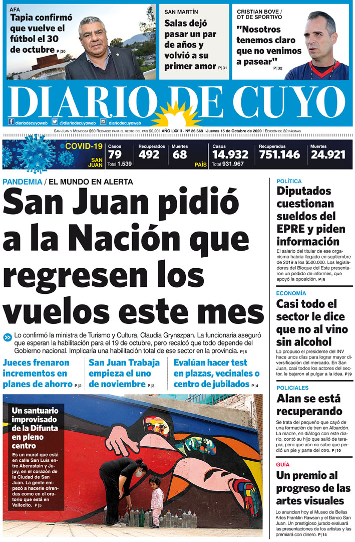 Diario de Cuyo | HOME | Noticias Tapa Edición 15 de Octubre del 2020 Por Redacción Diario de Cuyo 15/10/2020 · 0:00 Escuchar la noticia Escuchar la noticia Your browser doesn’t support HTML5 audio Ver los comentarios ›