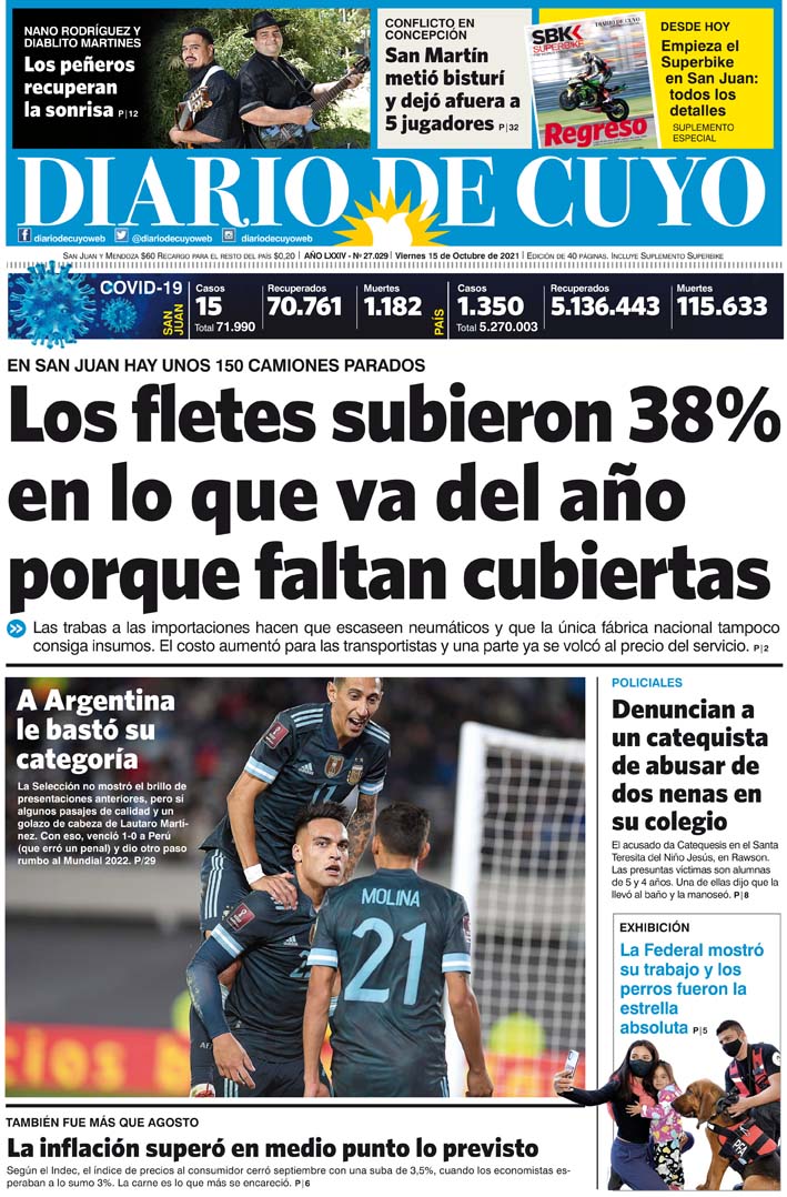 Diario de Cuyo | HOME | Noticias Tapa Edición 15 de Octubre del 2021 Por Redacción Diario de Cuyo 14/10/2021 · 0:00 Escuchar la noticia Escuchar la noticia Your browser doesn’t support HTML5 audio Ver los comentarios ›
