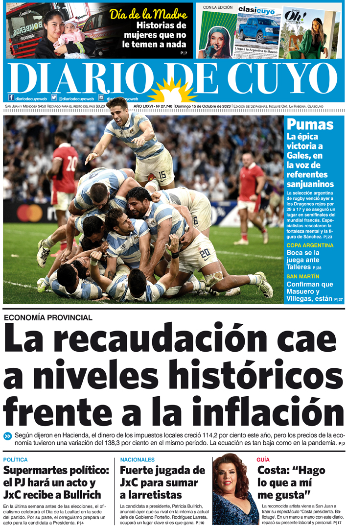 Diario de Cuyo | HOME | Noticias Tapa Edición 15 de Octubre del 2023 Por Redacción Diario de Cuyo 14/10/2023 · 0:00 Escuchar la noticia Escuchar la noticia Your browser doesn’t support HTML5 audio Ver los comentarios ›