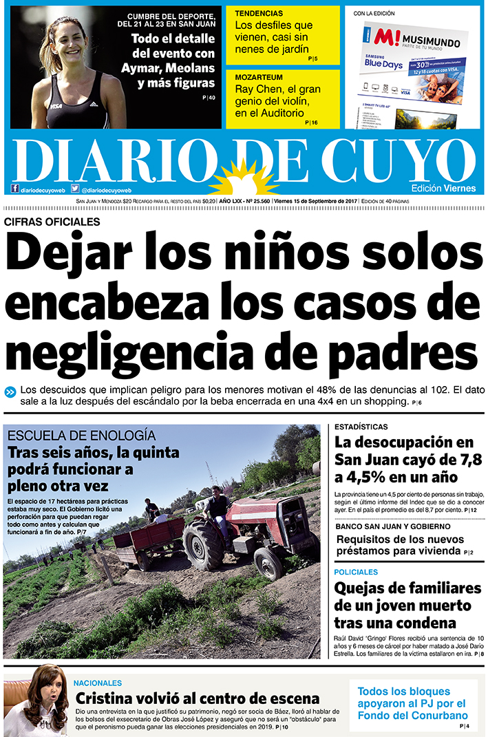 Diario de Cuyo | HOME | Noticias Tapa Edición 15 de Septiembre del 2017 Por Redacción Diario de Cuyo 14/09/2017 · 0:00 Escuchar la noticia Escuchar la noticia Your browser doesn’t support HTML5 audio Ver los comentarios ›