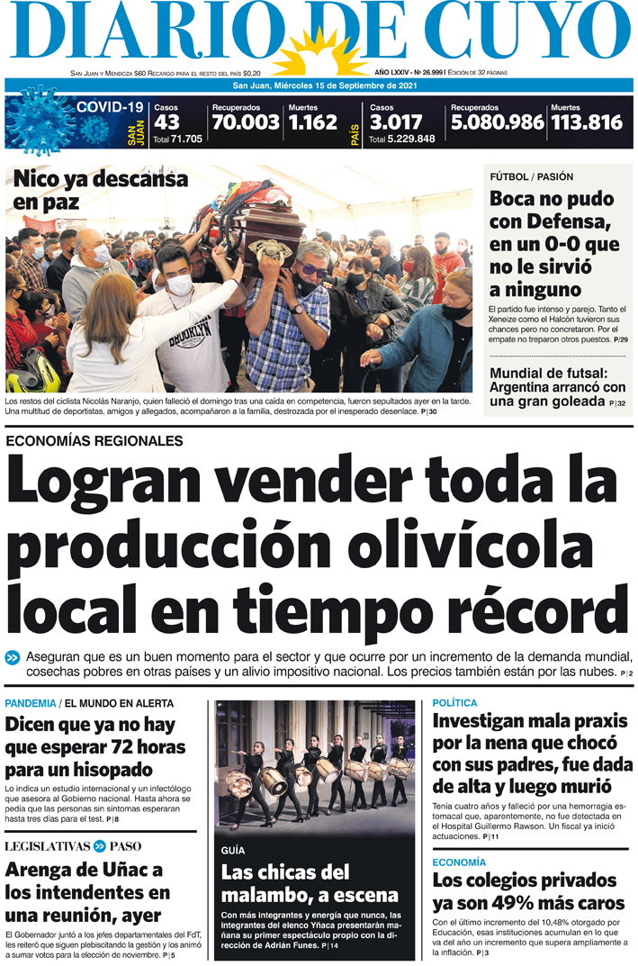 Diario de Cuyo | HOME | Noticias Tapa Edición 15 de Septiembre del 2021 Por Redacción Diario de Cuyo 15/09/2021 · 0:00 Escuchar la noticia Escuchar la noticia Your browser doesn’t support HTML5 audio Ver los comentarios ›