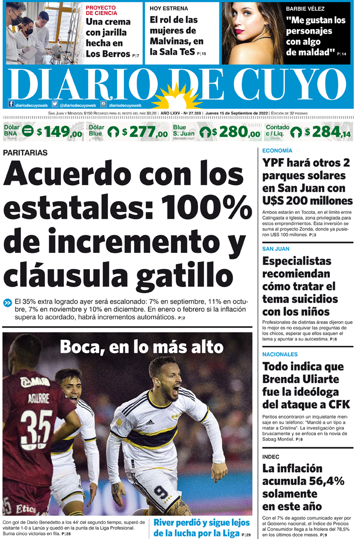 Diario de Cuyo | HOME | Noticias Tapa Edición 15 de Septiembre del 2022 Por Redacción Diario de Cuyo 15/09/2022 · 0:00 Escuchar la noticia Escuchar la noticia Your browser doesn’t support HTML5 audio Ver los comentarios ›
