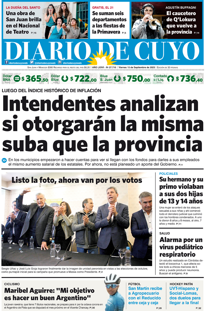 Diario de Cuyo | HOME | Noticias Tapa Edición 15 de Septiembre del 2023 Por Redacción Diario de Cuyo 14/09/2023 · 0:00 Escuchar la noticia Escuchar la noticia Your browser doesn’t support HTML5 audio Ver los comentarios ›