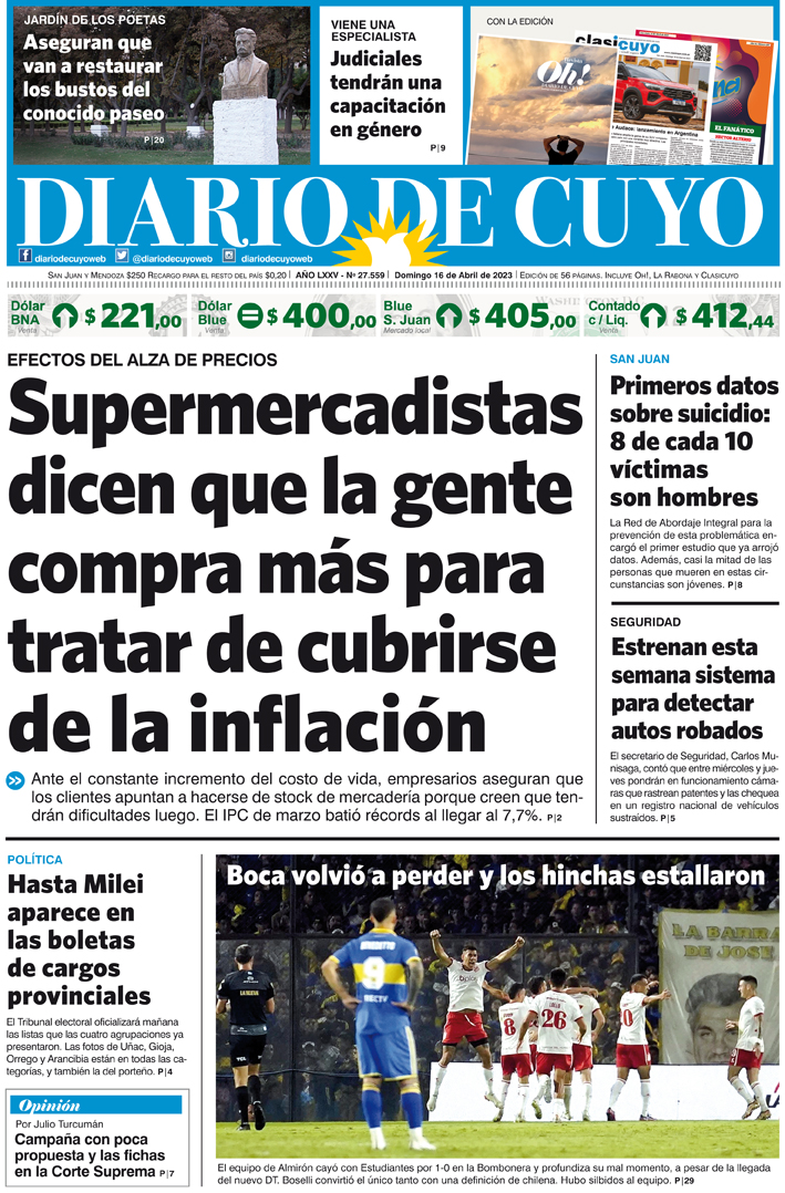 Diario de Cuyo | HOME | Noticias Tapa Edición 16 de Abril de 2023 Por Redacción Diario de Cuyo 15/04/2023 · 0:00 Escuchar la noticia Escuchar la noticia Your browser doesn’t support HTML5 audio Ver los comentarios ›