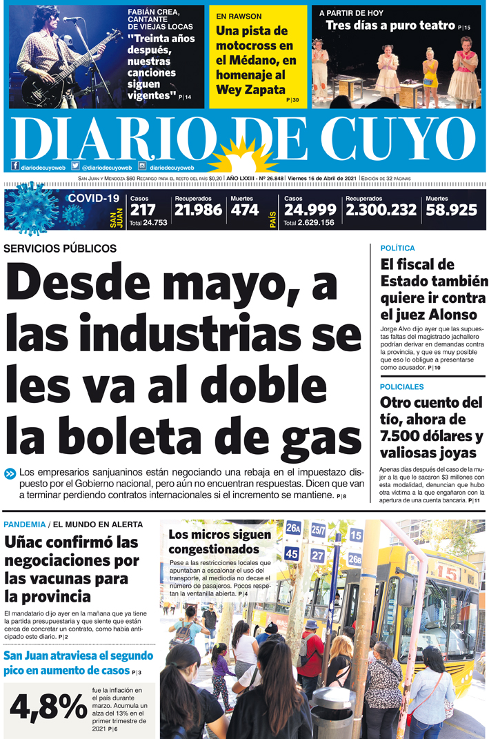 Diario de Cuyo | HOME | Noticias Tapa Edición 16 de Abril del 2021 Por Redacción Diario de Cuyo 15/04/2021 · 0:00 Escuchar la noticia Escuchar la noticia Your browser doesn’t support HTML5 audio Ver los comentarios ›