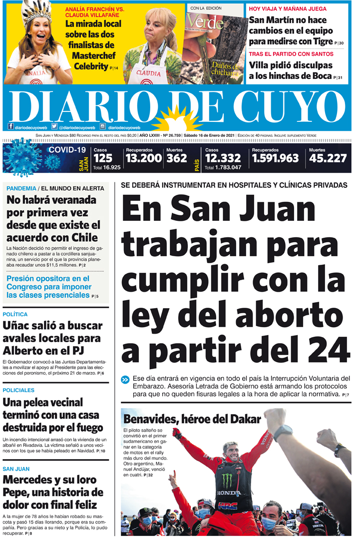 Diario de Cuyo | HOME | Noticias | Tapa Edición Tapa Edición 16 de Enero de 2021 Por Redacción Diario de Cuyo 15/01/2021 · 0:00 Escuchar la noticia Escuchar la noticia Your browser doesn’t support HTML5 audio Tapa Edición Ver los comentarios ›