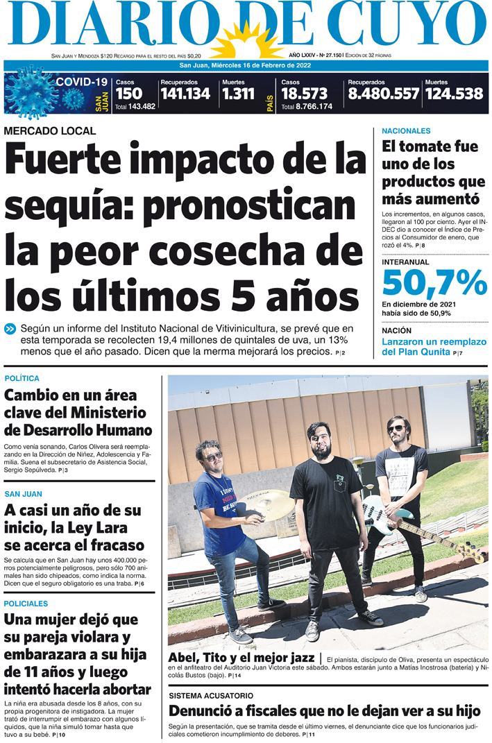 Diario de Cuyo | HOME | Noticias Tapa Edición 16 de Febrero del 2022 Por Redacción Diario de Cuyo 15/02/2022 · 0:00 Escuchar la noticia Escuchar la noticia Your browser doesn’t support HTML5 audio Ver los comentarios ›