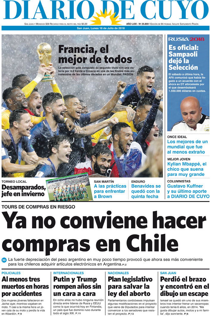 Diario de Cuyo | HOME | Noticias | Tapa Edición Tapa Edición 16 de Julio de 2018 Por Redacción Diario de Cuyo 15/07/2018 · 0:00 Escuchar la noticia Escuchar la noticia Your browser doesn’t support HTML5 audio Tapa Edición Ver los comentarios ›