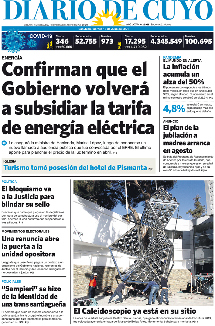 Diario de Cuyo | HOME | Noticias Tapa Edición 16 de Julio del 2021 Por Redacción Diario de Cuyo 15/07/2021 · 0:00 Escuchar la noticia Escuchar la noticia Your browser doesn’t support HTML5 audio Ver los comentarios ›