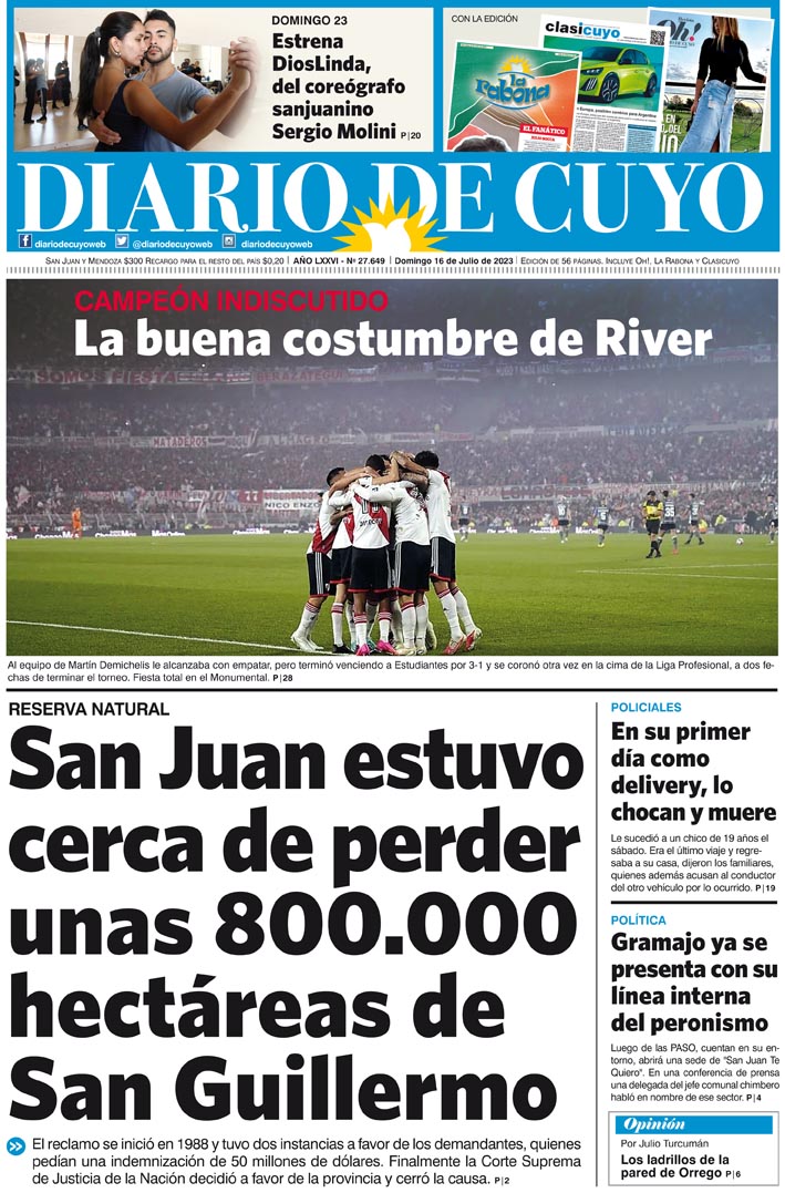 Diario de Cuyo | HOME | Noticias Tapa Edición 16 de Julio del 2023 Por Redacción Diario de Cuyo 15/07/2023 · 0:00 Escuchar la noticia Escuchar la noticia Your browser doesn’t support HTML5 audio Ver los comentarios ›
