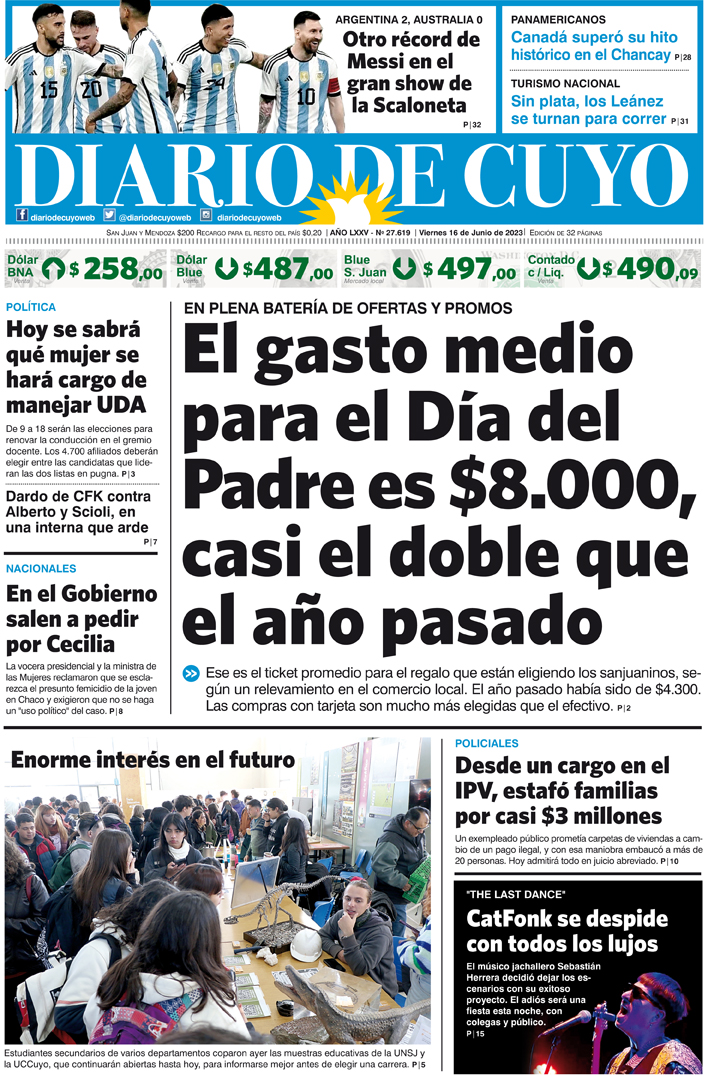 Diario de Cuyo | HOME | Noticias Tapa Edición 16 de Junio de 2023 Por Redacción Diario de Cuyo 15/06/2023 · 0:00 Escuchar la noticia Escuchar la noticia Your browser doesn’t support HTML5 audio Ver los comentarios ›