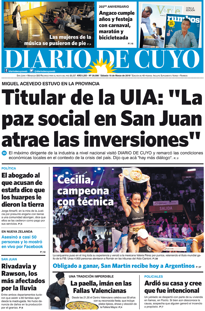Diario de Cuyo | HOME | Noticias | Tapa Edición Tapa Edición 16 de Marzo 2019 Por Redacción Diario de Cuyo 16/03/2019 · 0:00 Escuchar la noticia Escuchar la noticia Your browser doesn’t support HTML5 audio Tapa Edición Ver los comentarios ›
