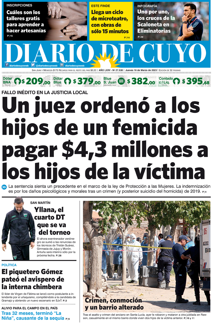 Diario de Cuyo | HOME | Noticias Tapa Edición 16 de Marzo del 2023 Por Redacción Diario de Cuyo 15/03/2023 · 0:00 Escuchar la noticia Escuchar la noticia Your browser doesn’t support HTML5 audio Ver los comentarios ›