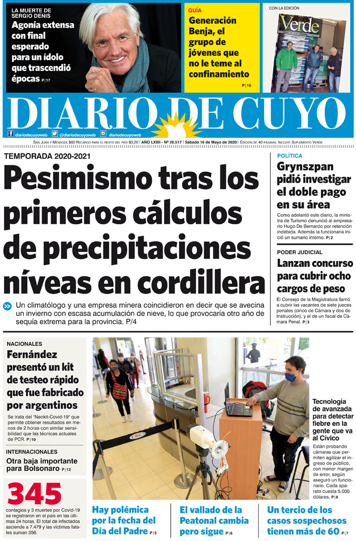 Diario de Cuyo | HOME | Noticias Tapa Edición 16 de Mayo del 2020 Por Redacción Diario de Cuyo 15/05/2020 · 0:00 Escuchar la noticia Escuchar la noticia Your browser doesn’t support HTML5 audio Ver los comentarios ›