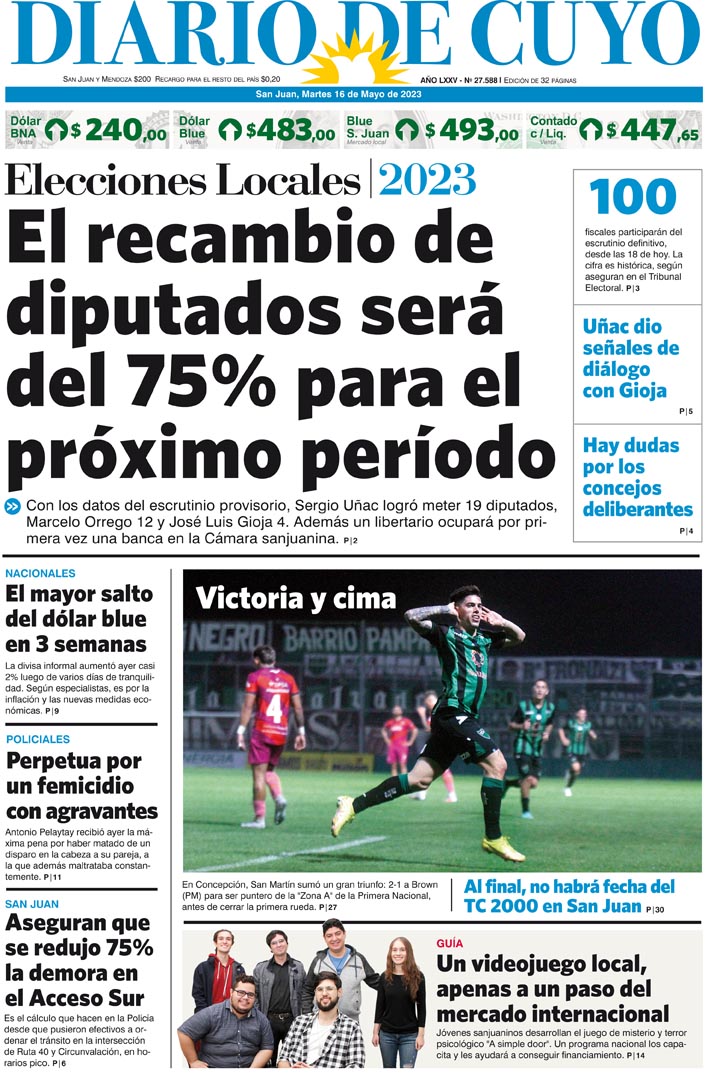 Diario de Cuyo | HOME | Noticias Tapa Edición 16 de Mayo del 2023 Por Redacción Diario de Cuyo 16/05/2023 · 0:00 Escuchar la noticia Escuchar la noticia Your browser doesn’t support HTML5 audio Ver los comentarios ›