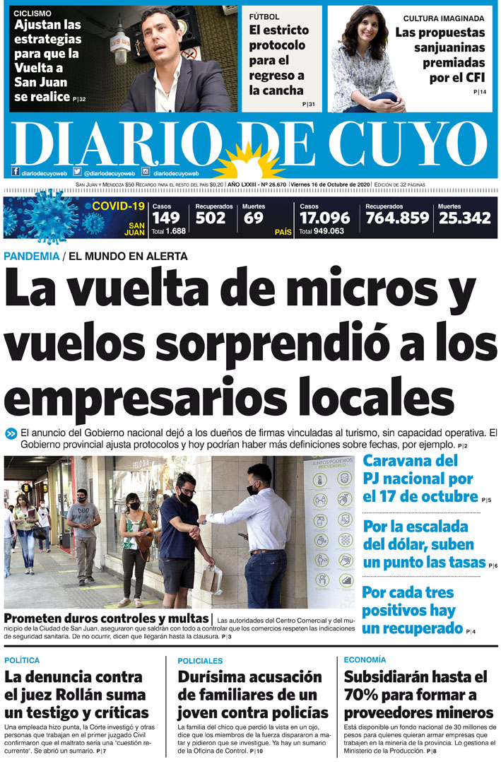 Diario de Cuyo | HOME | Noticias Tapa Edición 16 de Octubre del 2020 Por Redacción Diario de Cuyo 16/10/2020 · 0:00 Escuchar la noticia Escuchar la noticia Your browser doesn’t support HTML5 audio Ver los comentarios ›