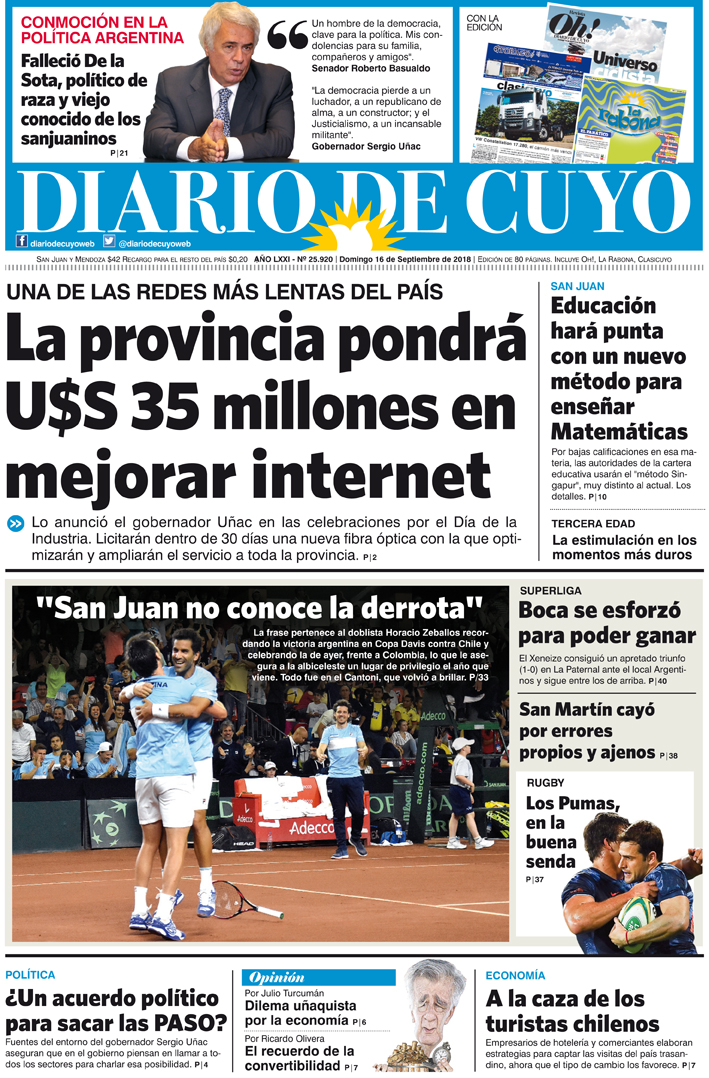 Diario de Cuyo | HOME | Noticias | Tapa Edición Tapa Edición 16 de Septiembre de 2018 Por Redacción Diario de Cuyo 16/09/2018 · 0:00 Escuchar la noticia Escuchar la noticia Your browser doesn’t support HTML5 audio Tapa Edición Ver los comentarios ›