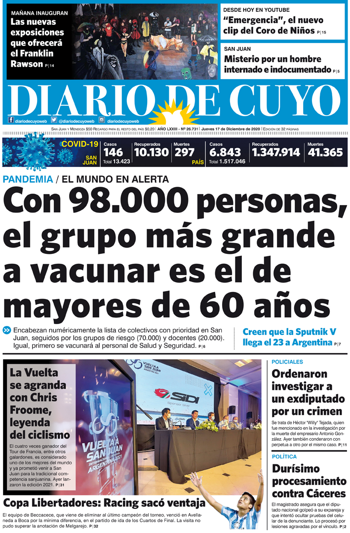 Diario de Cuyo | HOME | Noticias Tapa Edición 17 de Diciembre del 2020 Por Redacción Diario de Cuyo 16/12/2020 · 0:00 Escuchar la noticia Escuchar la noticia Your browser doesn’t support HTML5 audio Ver los comentarios ›