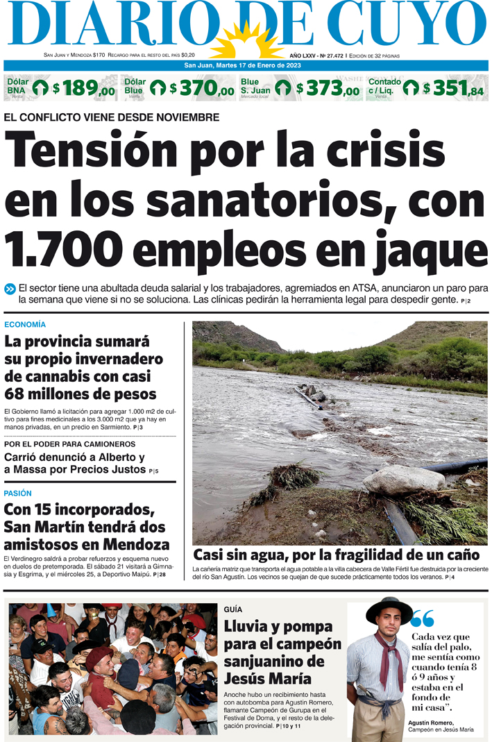 Diario de Cuyo | HOME | Noticias Tapa Edición 17 de Enero del 2023 Por Redacción Diario de Cuyo 16/01/2023 · 0:00 Escuchar la noticia Escuchar la noticia Your browser doesn’t support HTML5 audio Ver los comentarios ›