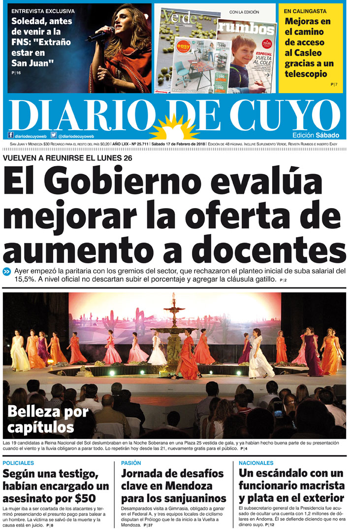 Diario de Cuyo | HOME | Noticias | Tapa Edición Tapa Edición 17 de Febrero del 2018 Por Redacción Diario de Cuyo 16/02/2018 · 0:00 Escuchar la noticia Escuchar la noticia Your browser doesn’t support HTML5 audio Tapa Edición Ver los comentarios ›