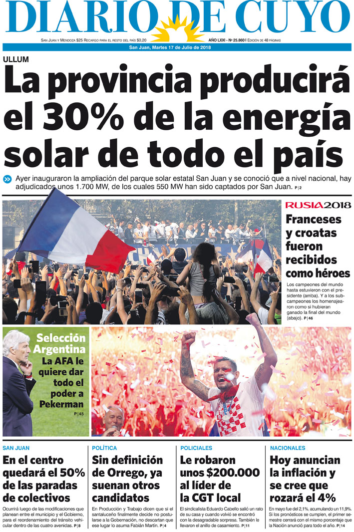 Diario de Cuyo | HOME | Noticias | Tapa Edición Tapa Edición 17 de Julio 2018 Por Redacción Diario de Cuyo 16/07/2018 · 0:00 Escuchar la noticia Escuchar la noticia Your browser doesn’t support HTML5 audio Tapa Edición Ver los comentarios ›