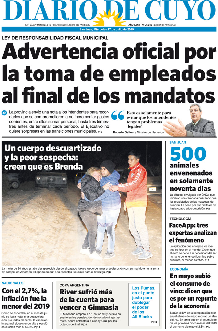 Diario de Cuyo | HOME | Noticias | Tapa Edición Tapa Edición 17 de Julio de 2019 Por Redacción Diario de Cuyo 17/07/2019 · 0:00 Escuchar la noticia Escuchar la noticia Your browser doesn’t support HTML5 audio Tapa Edición Ver los comentarios ›