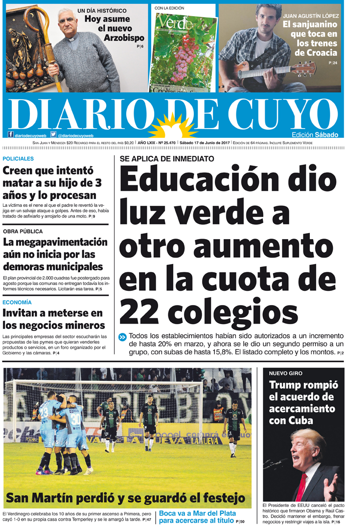Diario de Cuyo | HOME | Noticias Tapa Edición 17 de Junio del 2017 Por Redacción Diario de Cuyo 17/06/2017 · 0:00 Escuchar la noticia Escuchar la noticia Your browser doesn’t support HTML5 audio Ver los comentarios ›