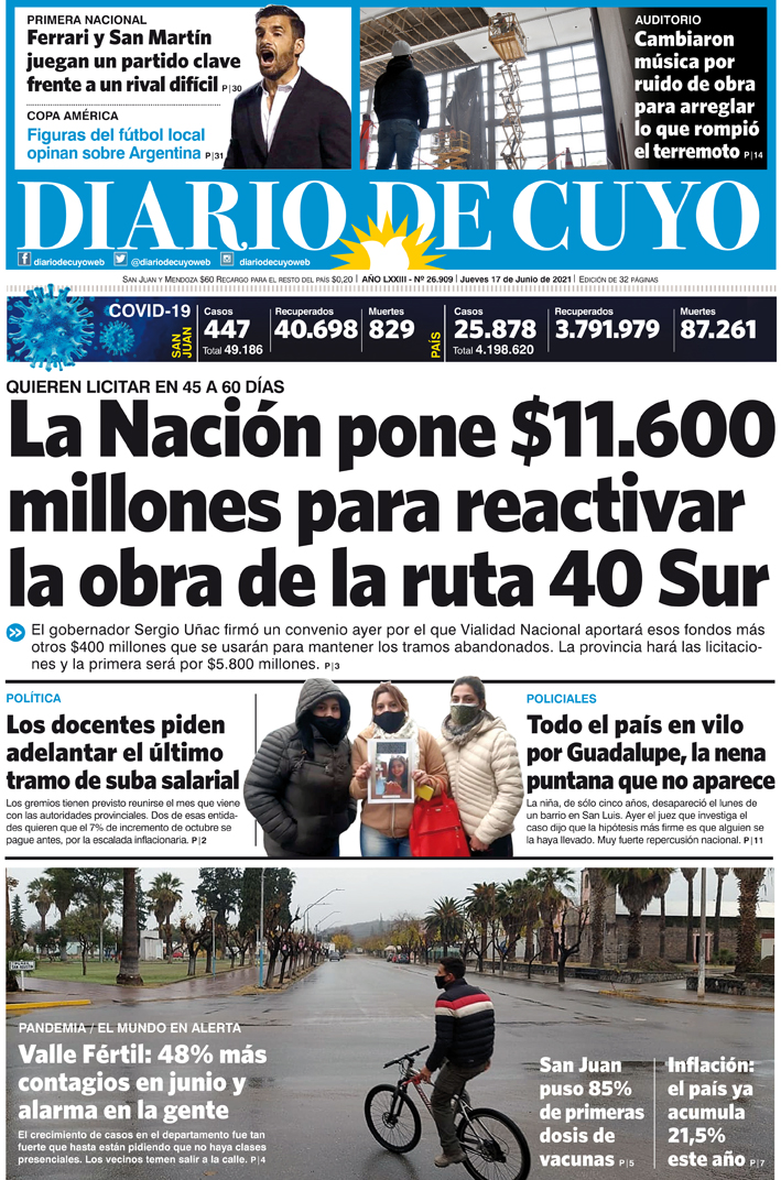 Diario de Cuyo | HOME | Noticias Tapa Edición 17 de Junio del 2021 Por Redacción Diario de Cuyo 16/06/2021 · 0:00 Escuchar la noticia Escuchar la noticia Your browser doesn’t support HTML5 audio Portada 17 de junio by Diario de Cuyo on Scribd Ver los comentarios ›