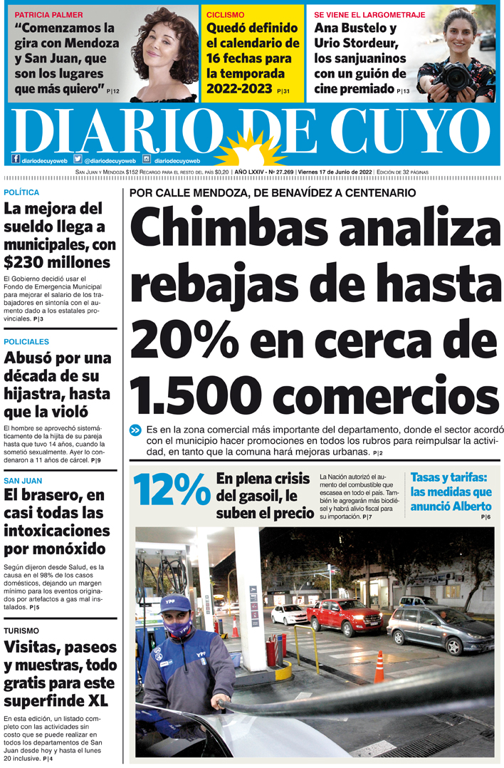 Diario de Cuyo | HOME | Noticias Tapa Edición 17 de Junio del 2022 Por Redacción Diario de Cuyo 17/06/2022 · 0:00 Escuchar la noticia Escuchar la noticia Your browser doesn’t support HTML5 audio Ver los comentarios ›