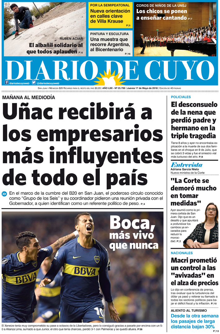 Diario de Cuyo | HOME | Noticias Tapa Edición 17 de Mayo de 2018 Por Redacción Diario de Cuyo 17/05/2018 · 0:00 Escuchar la noticia Escuchar la noticia Your browser doesn’t support HTML5 audio Ver los comentarios ›