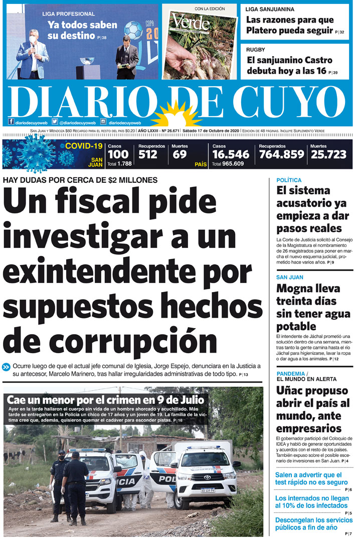 Diario de Cuyo | HOME | Noticias Tapa Edición 17 de Octubre del 2020 Por Redacción Diario de Cuyo 17/10/2020 · 0:00 Escuchar la noticia Escuchar la noticia Your browser doesn’t support HTML5 audio Ver los comentarios ›